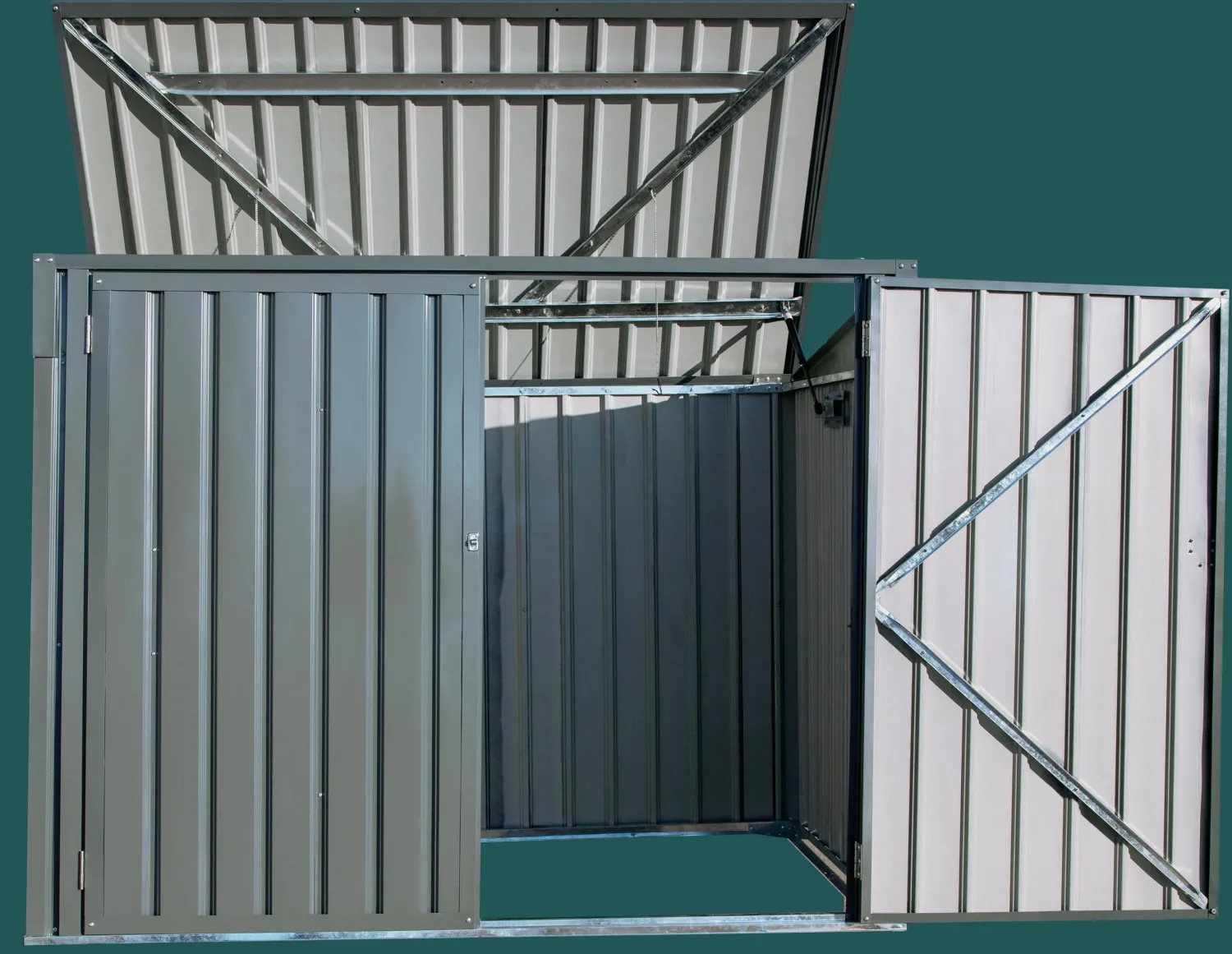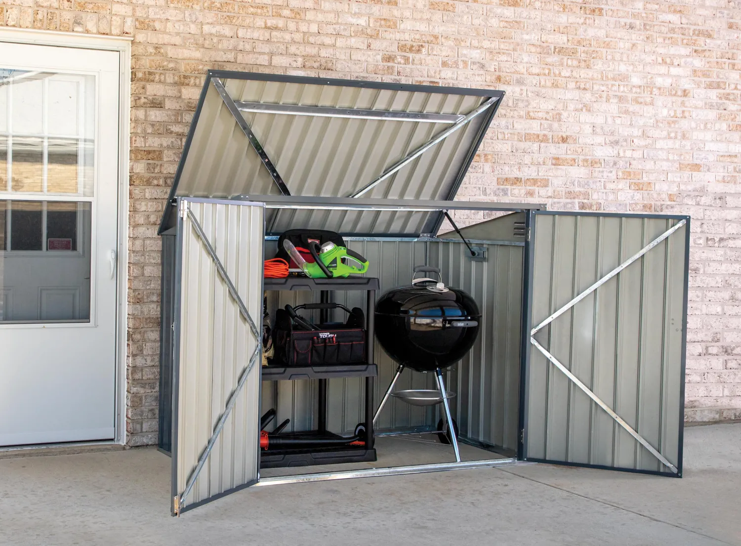 - EASY ACCESS – use the two lockable swing doors to move large items in and out of the shed or with the help of the pneumatic lifts opening and closing the top lid is a breeze