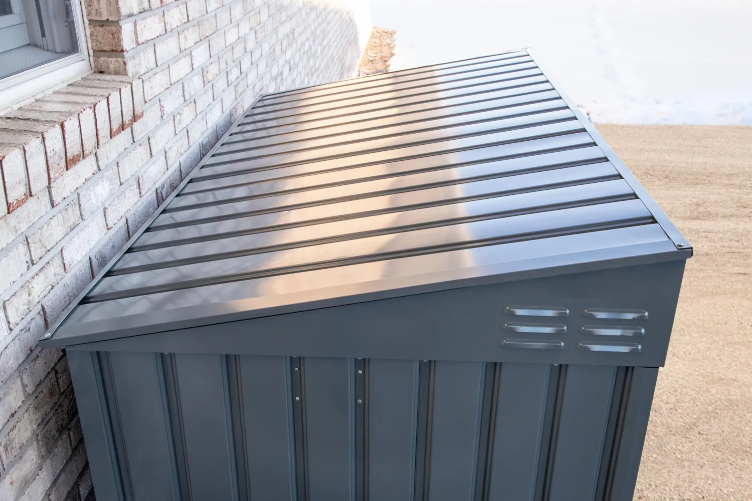 - CONVIENENT STORAGE WHERE YOU NEED IT- The 6 x 3 footprint and slanted roof design is great for patios, decks, walkways, in the garage or on the side of your house. This attractive horizontal shed with a Grey finish is an easy to access solution for trash cans, bicycles, patio equipment and so much more