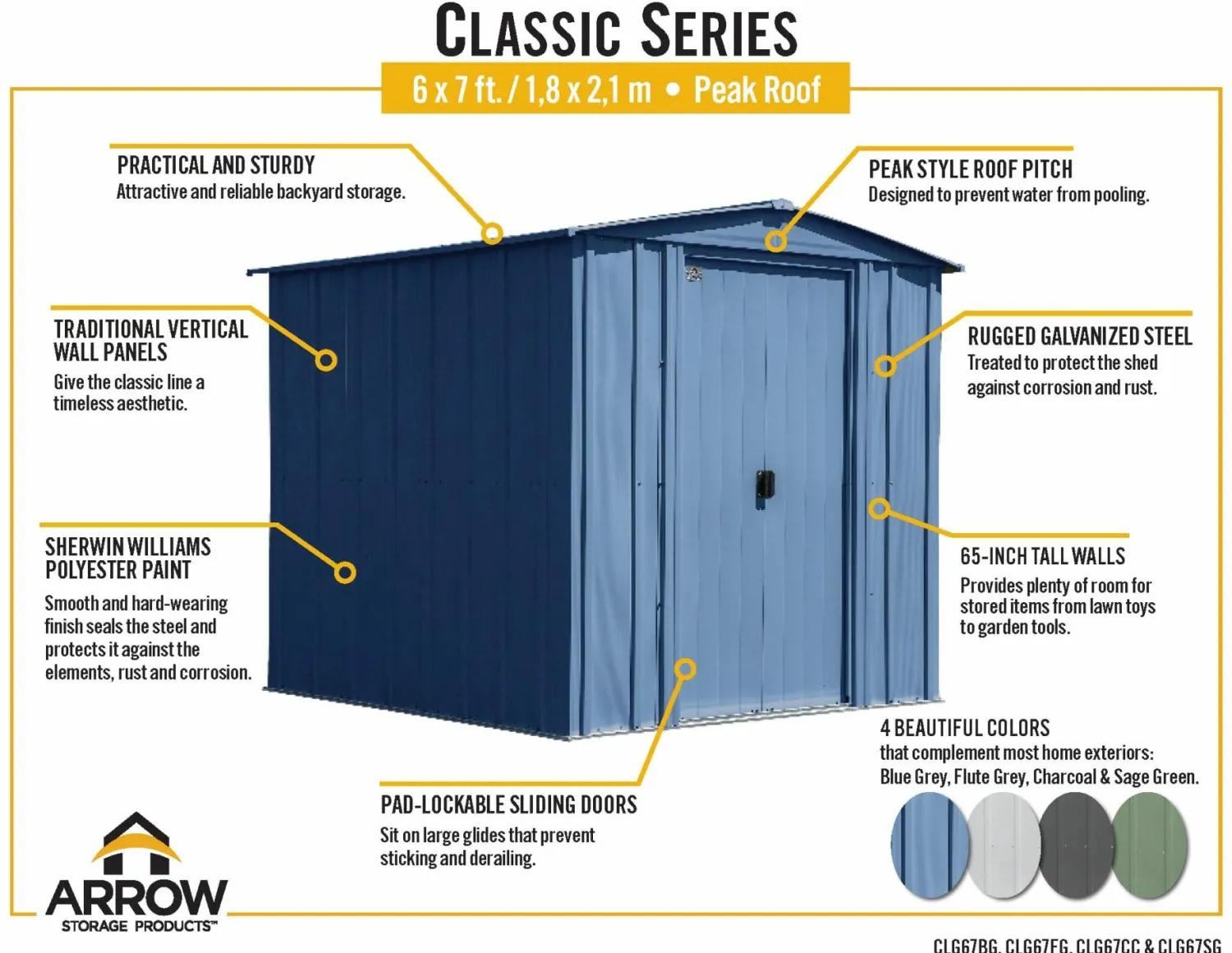 - 65 in. walls provide easy access to stored items from lawn mowers to garden tools