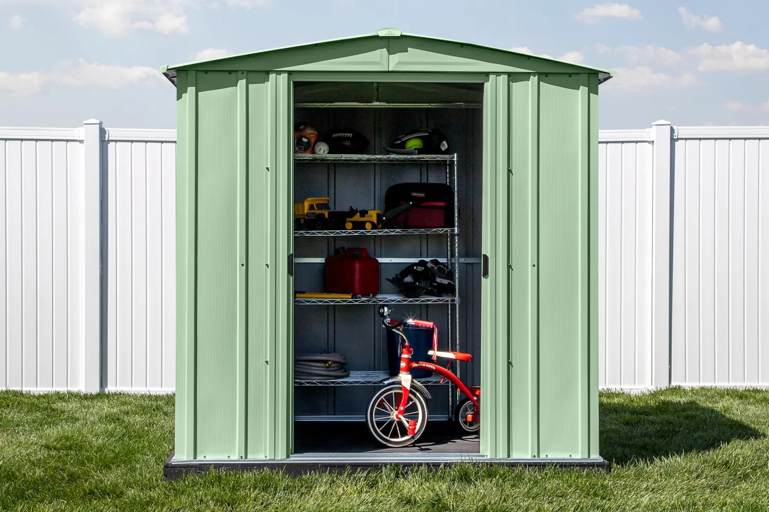 Are you looking for a practical, sturdy storage unit for your backyard? The Arrow steel storage shed is engineered to protect your landscaping equipment, tools, and gardening supplies, safe from the elements. The shed is made of galvanized steel that’s treated to prevent rust and corrosion. It has a low gable roof that’s designed to prevent water from pooling. It has sliding doors that can be secured with a padlock. The Arrow shed is a good-looking unit, too. The shed’s timeless vertical wall panels are finished with smooth, hard-wearing Sherwin-Williams Paint finish protects against the elements and seals the steel against rust and corrosion.