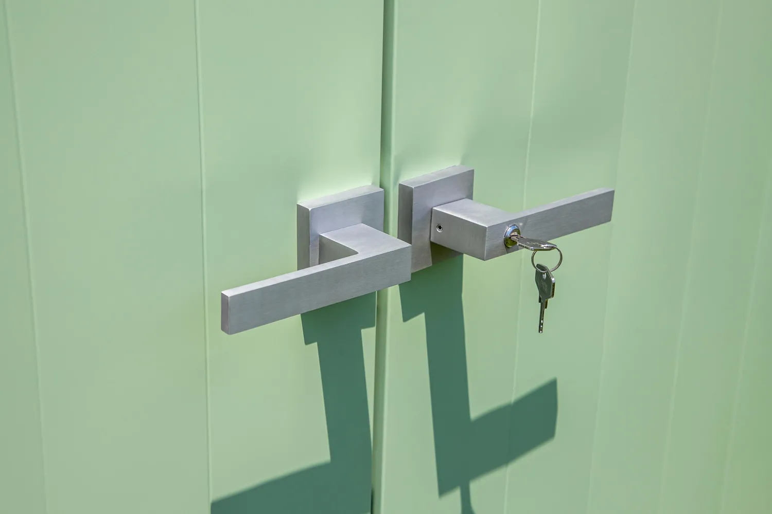 - Swing doors increase usable storage space, and includes integrated keyed brusthed metal locking handles for added security and a sophisticated look