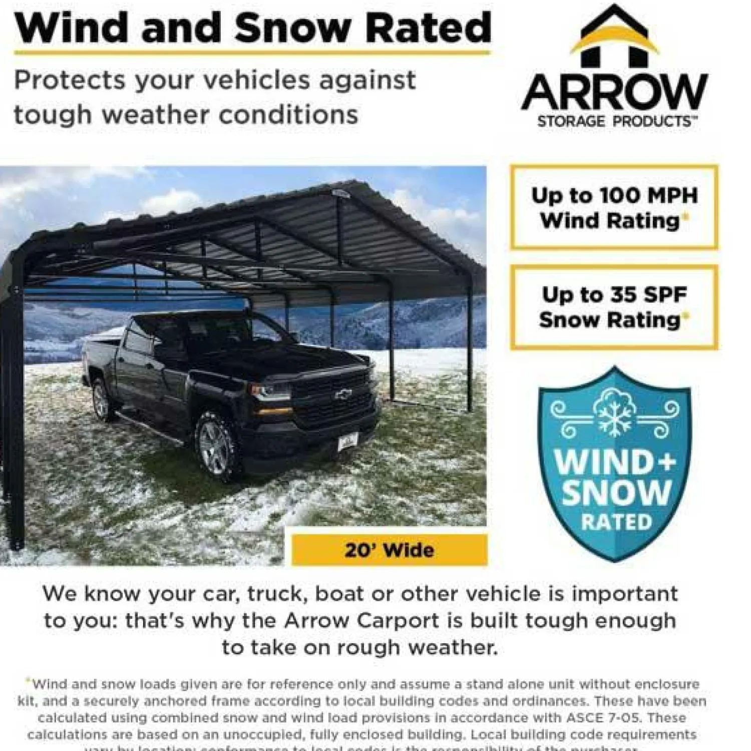- Built strong with a 2 in. square tube, 15 gauge wall thickness. The Arrow Carport delivers wind and snow load strength and stability.