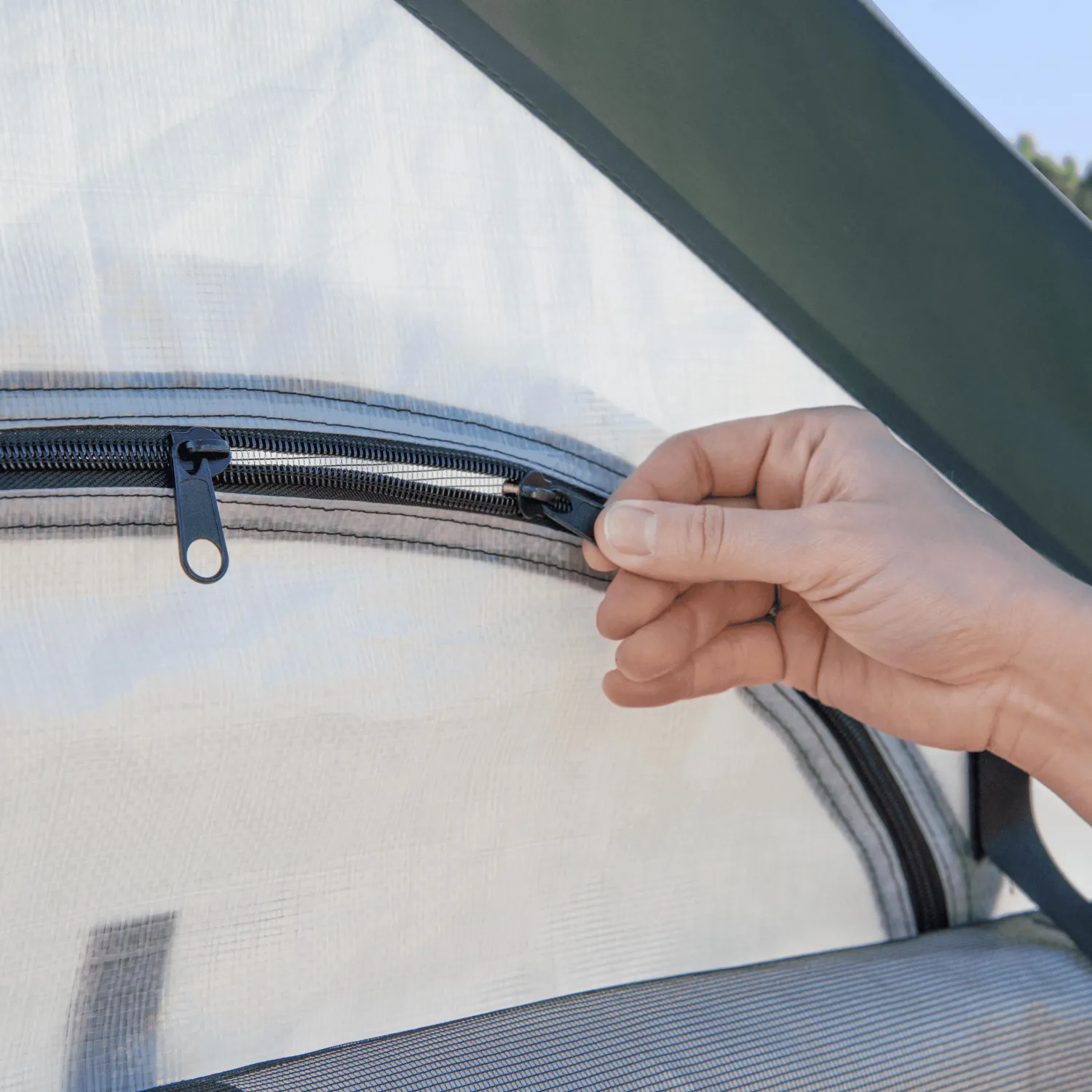 - Half-moon-shaped zippered screens on both end panels for adjustable air circulation