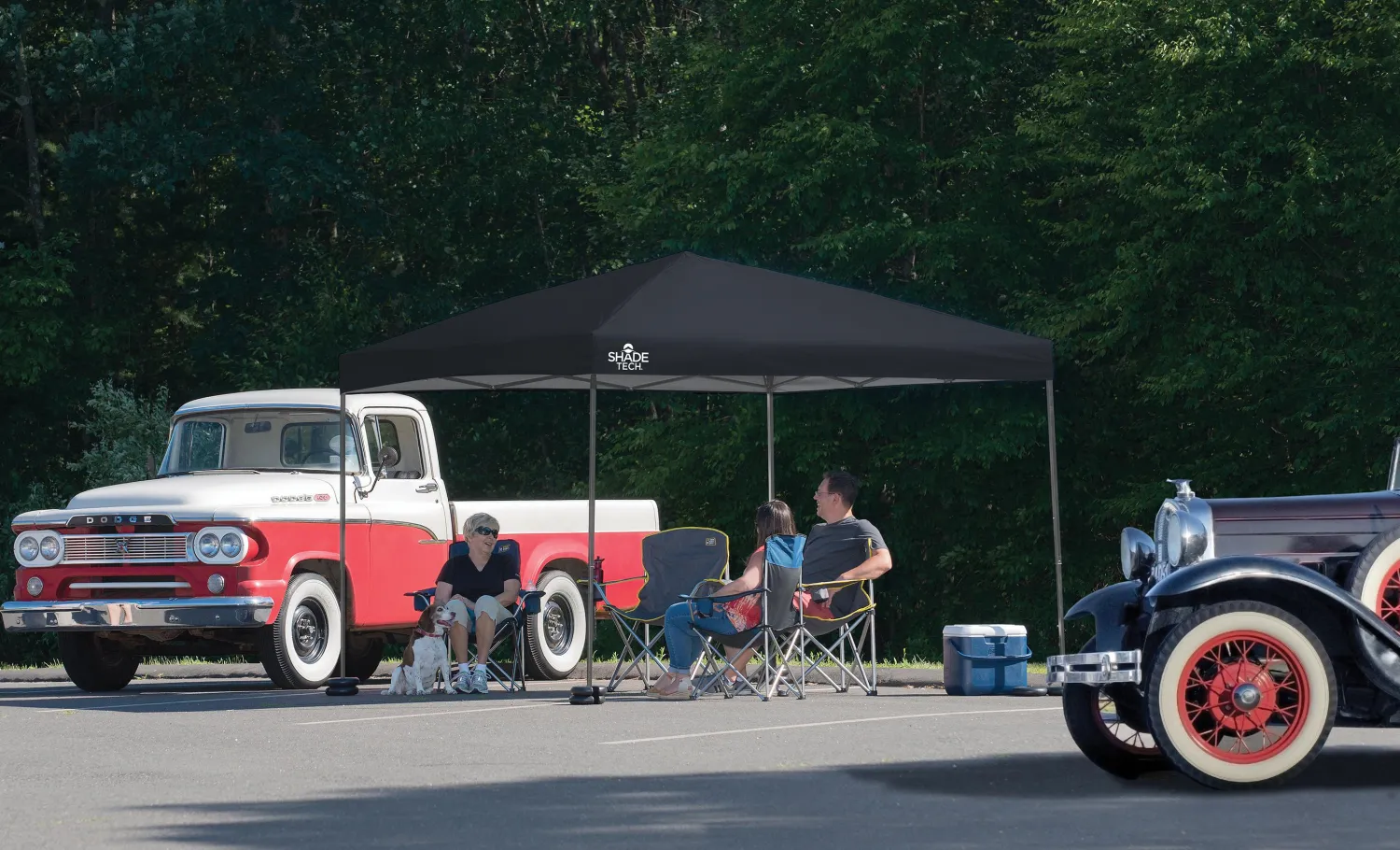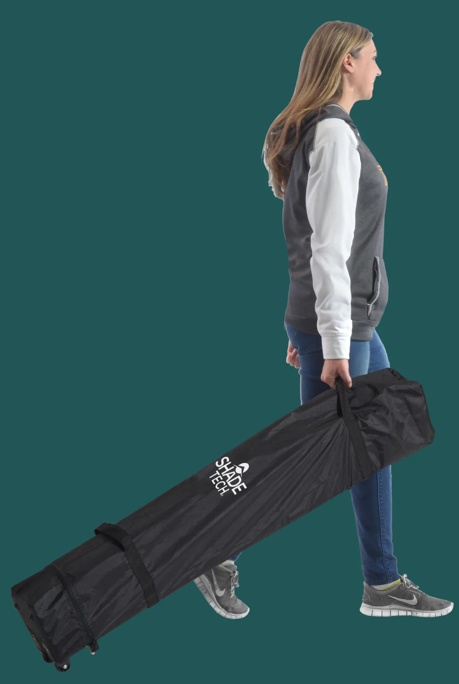 The affordable and dependable Shade Tech 10 ft. x 10 ft. straight-leg canopy tent offers reliable shade where you need it. It features 3 height positions for variations, a rigid eave construction, and shades up to 100 sq. ft. The Aluminex fabric cover offer 99% UV protection and the push button sliders with padded levers make this canopy easy to assemble.