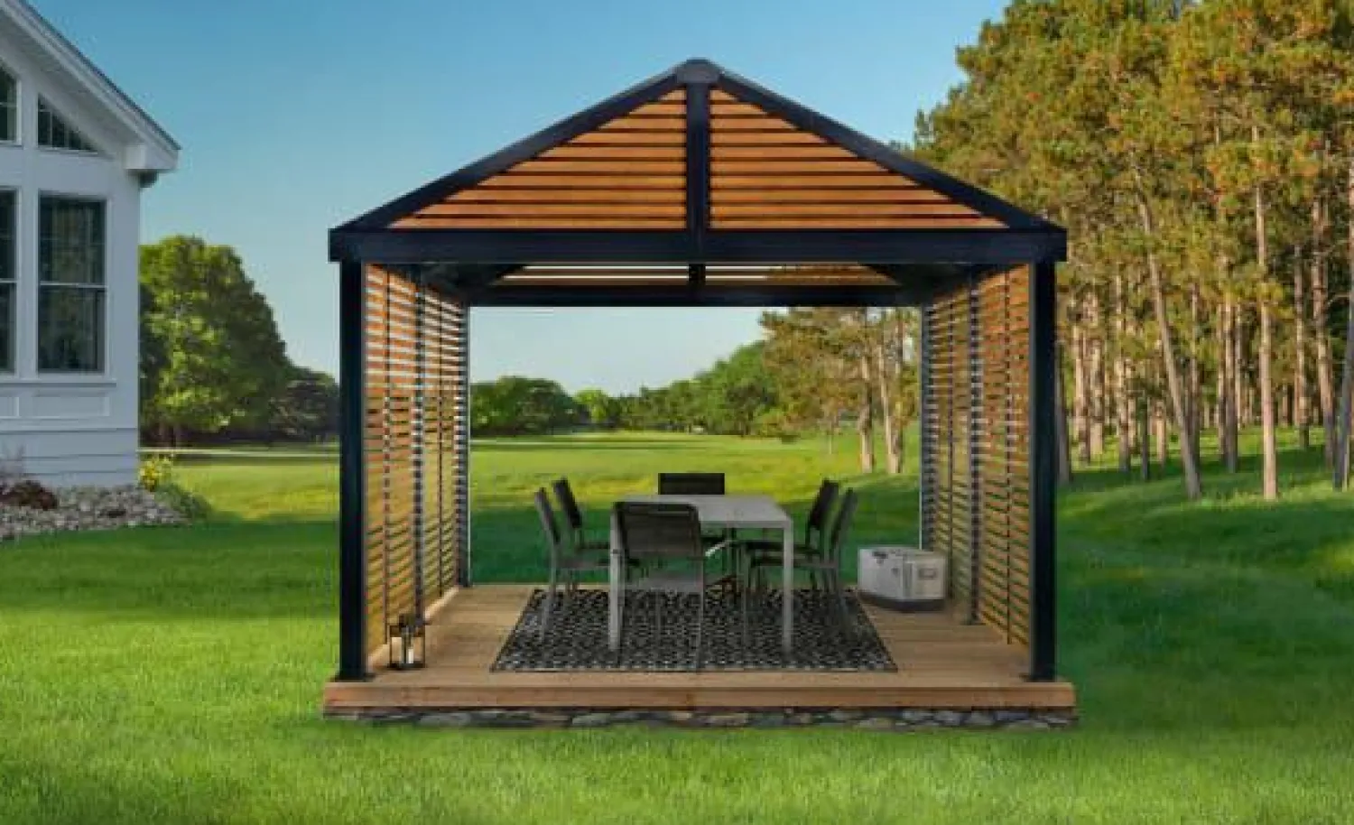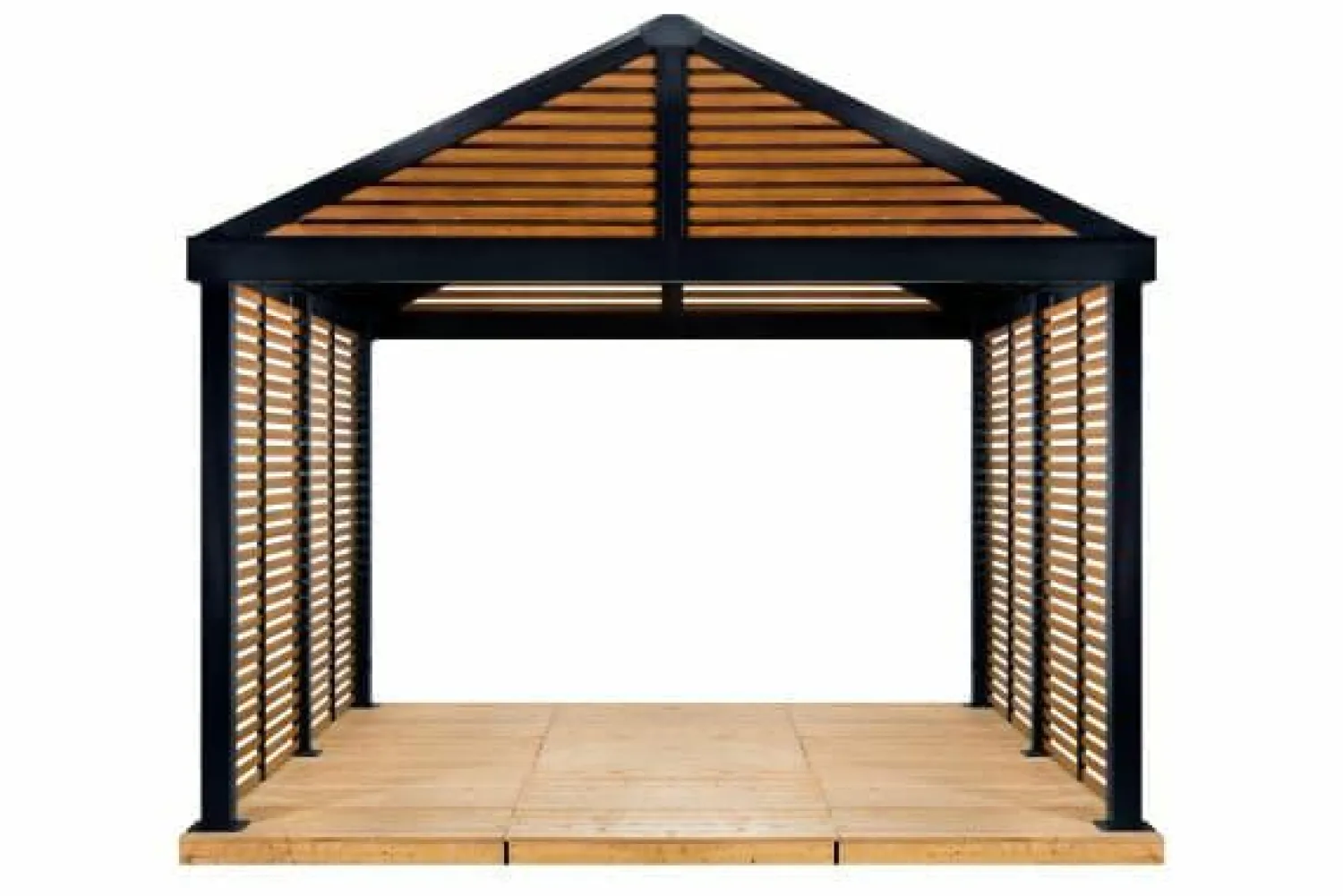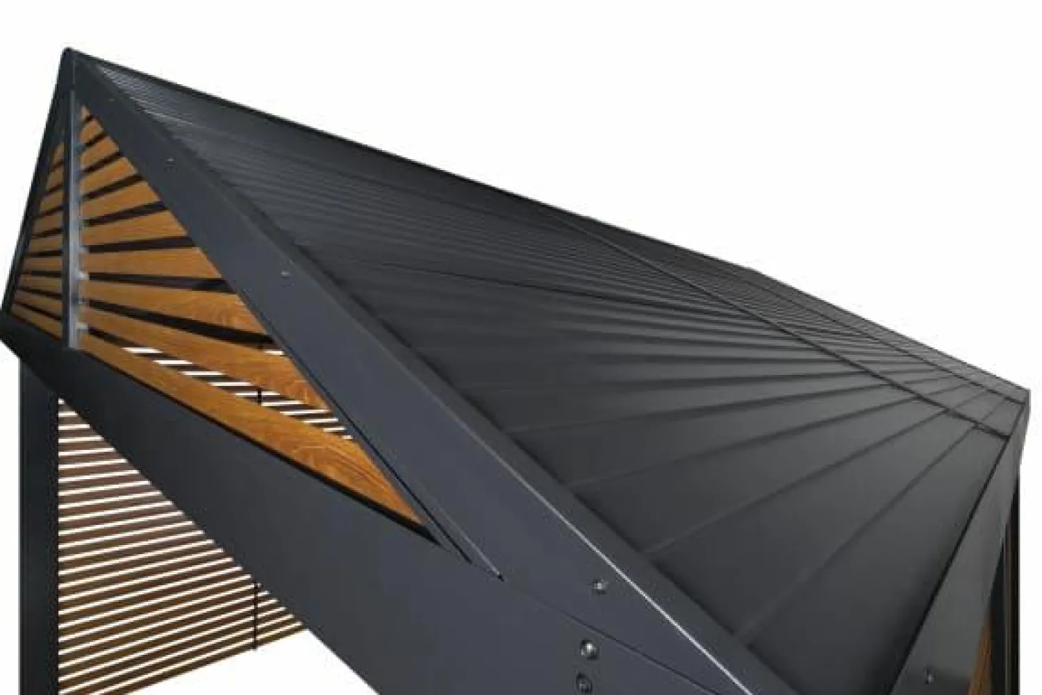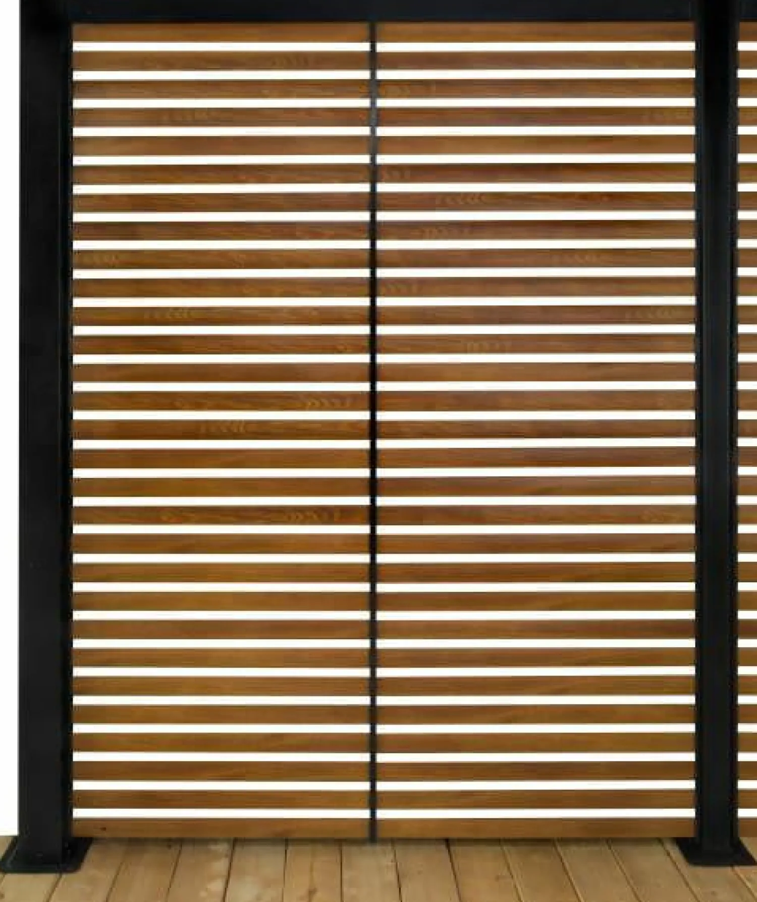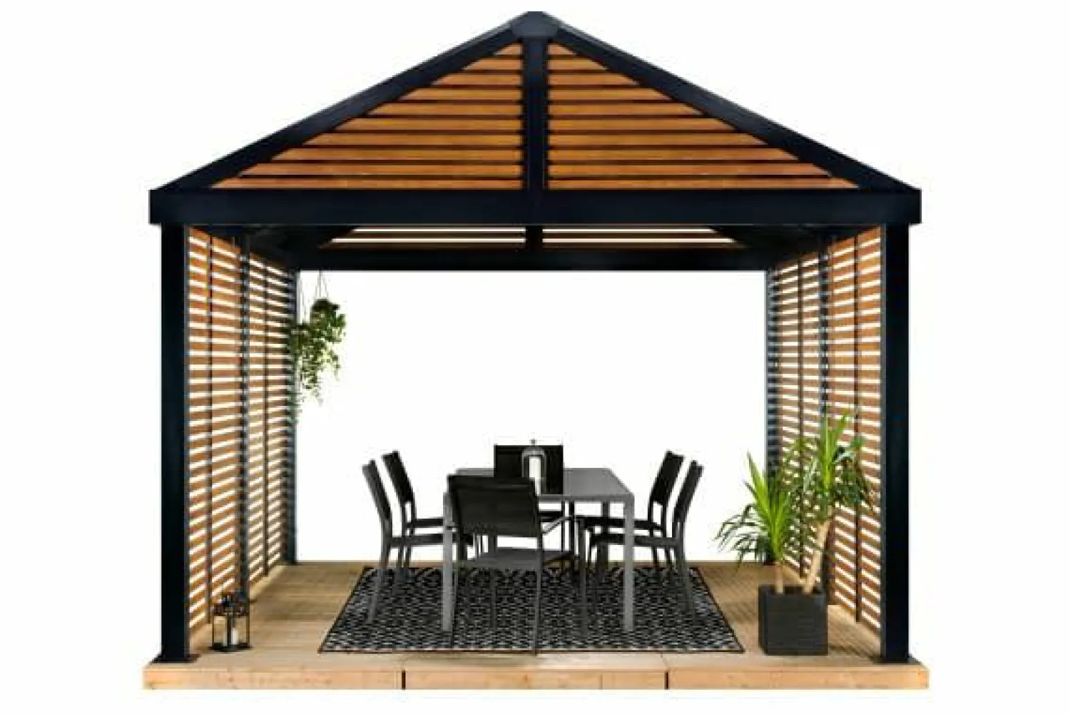 Rediscover your backyard with the Boda gazebo. This gazebo offers not only protection from the sun, but also the possibility to have more intimacy. With its two louver walls, you can create the look you want by installing them on any side and even choose to make full or half walls. Its modern design and dark tones will add style to your backyard, while its robust rustproof aluminum structure and galvanized steel roof will make it durable for years to come.