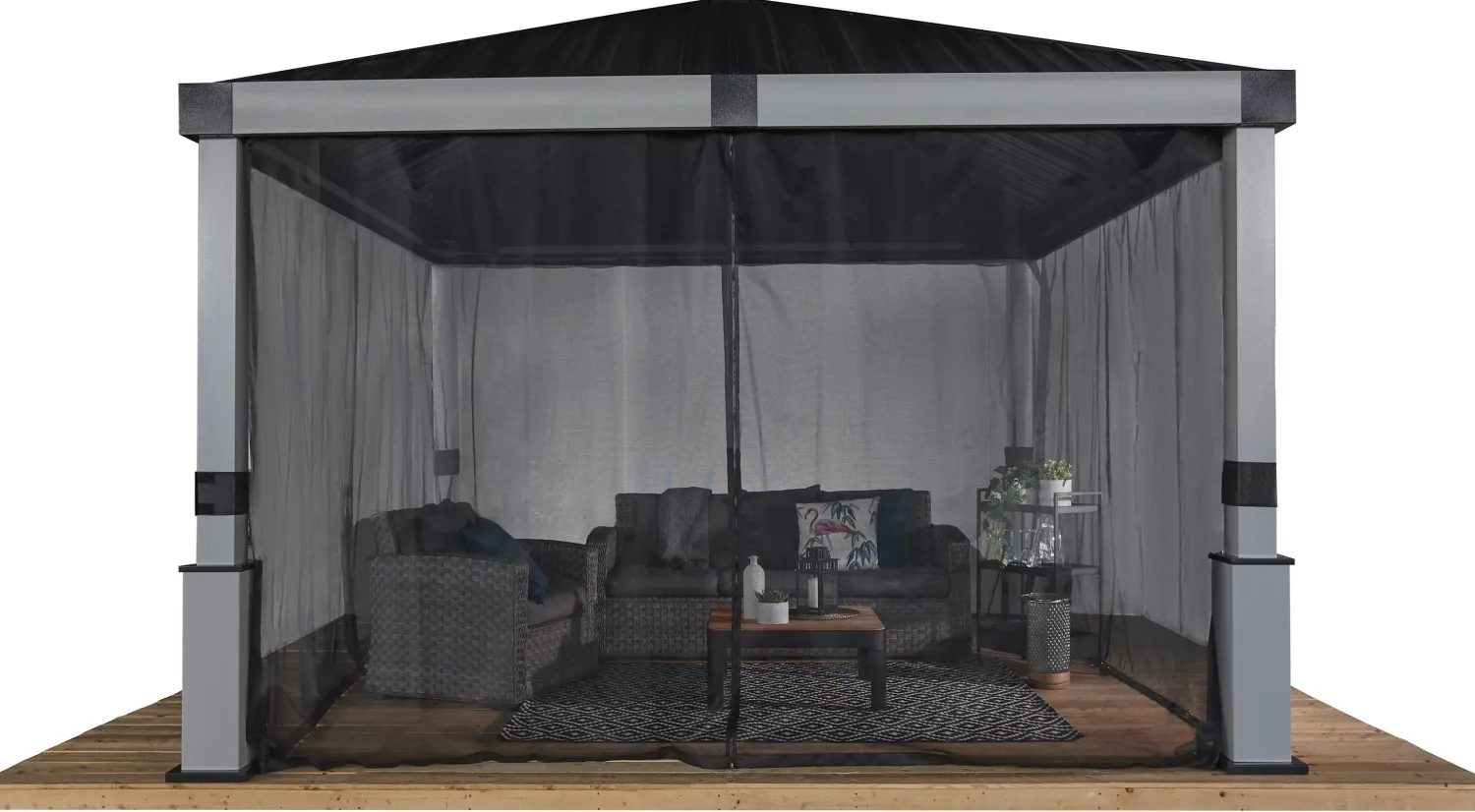 Experience your backyard in a new way with the Lena gazebo. The modern design and dual-tone color scheme will add style to your backyard, while its robust rustproof aluminum structure and galvanized steel roof ensure an everlasting appearance for years to come. PVC-coated mosquito netting allows users to relax under the shade of the gazebo undisturbed. Start your ideal backyard experience today with the Lena sun shelter.