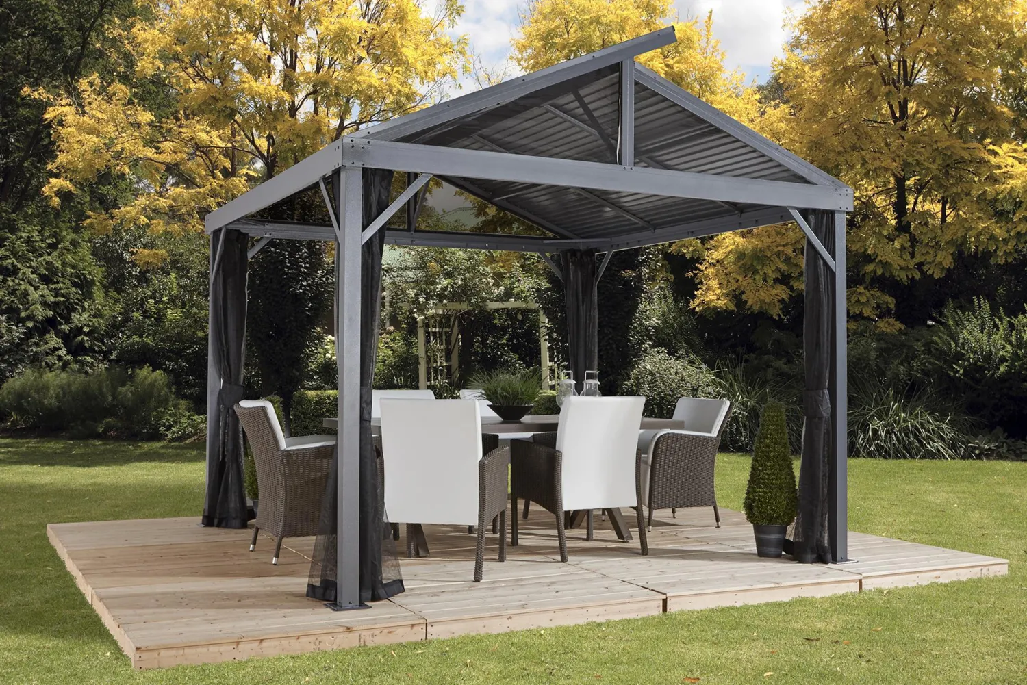 Modernize your outdoor relaxation area with the Sojag Sanibel II Gazebo sun shelter generation from Sojag. Having clean lines, without fancy frills, it is as practical as it is attractive. Being offered with three different roof versions, it will satisfy the designer in you. Just search for Sanibel and Sanibel I to compare and make your choice. Regardless of the version, the Sanibel will provide you the desired shade using galvanized steel roof and will serve as an outdoor dining room when you receive family and friends.