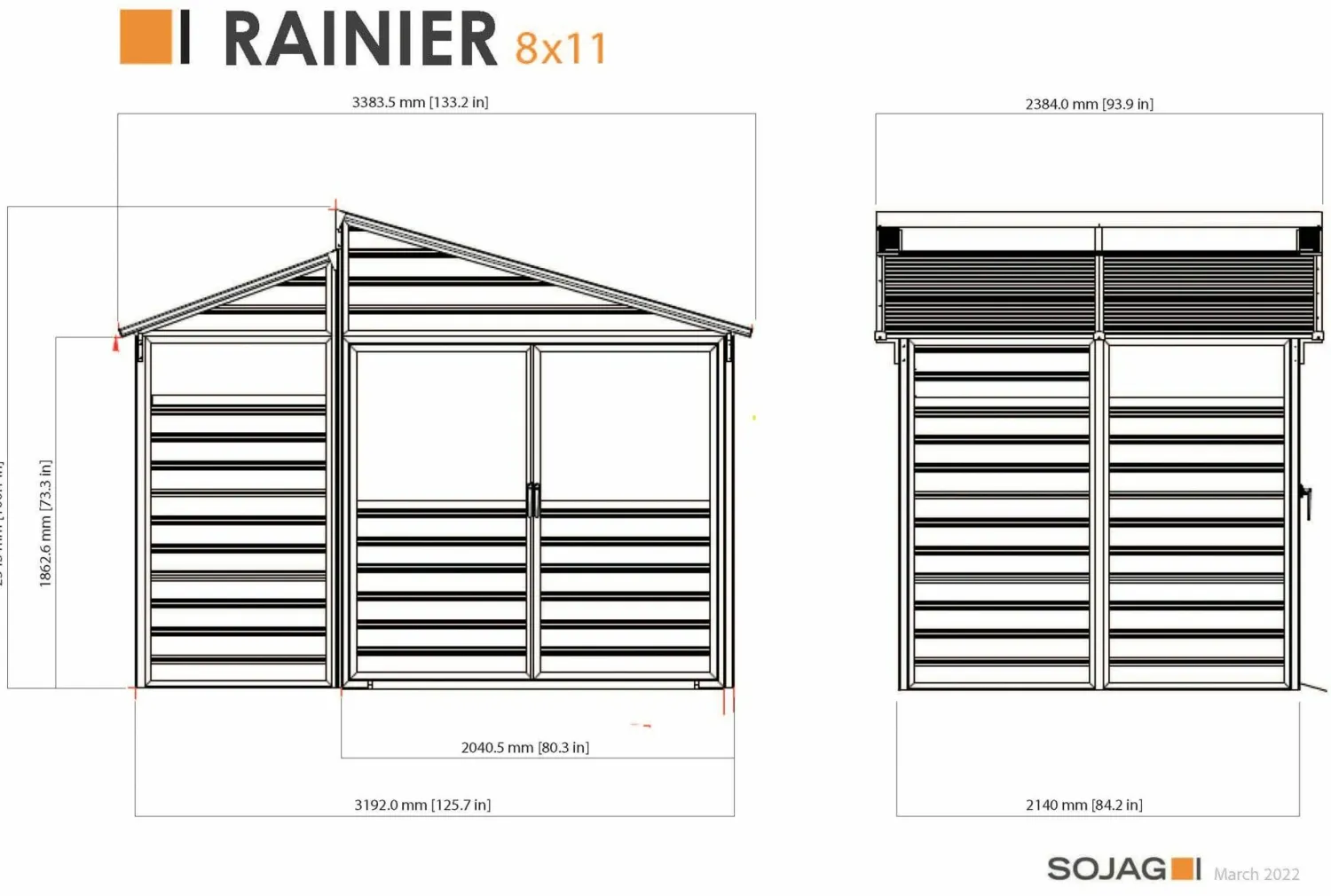 Sojag’s Rainier 8 x 11 ft. Rustproof Aluminum Storage Shed is a contemporary, yet practical storage solution. It’s slanted roof is encased by polycarbonate panels that allow ample natural light into the shed, enabling users clear view while locating yard equipment and materials. The shed’s frame is made of a powder coated aluminum that is scratch resistant and rustproof. The roof is made of sturdy galvanized steel panels. 449 cu ft. of space and 6 ft 8 inch double doors make storage of large equipment simple. Enhance your backyard today in style and utility with Sojag’s Rainier Storage Shed.