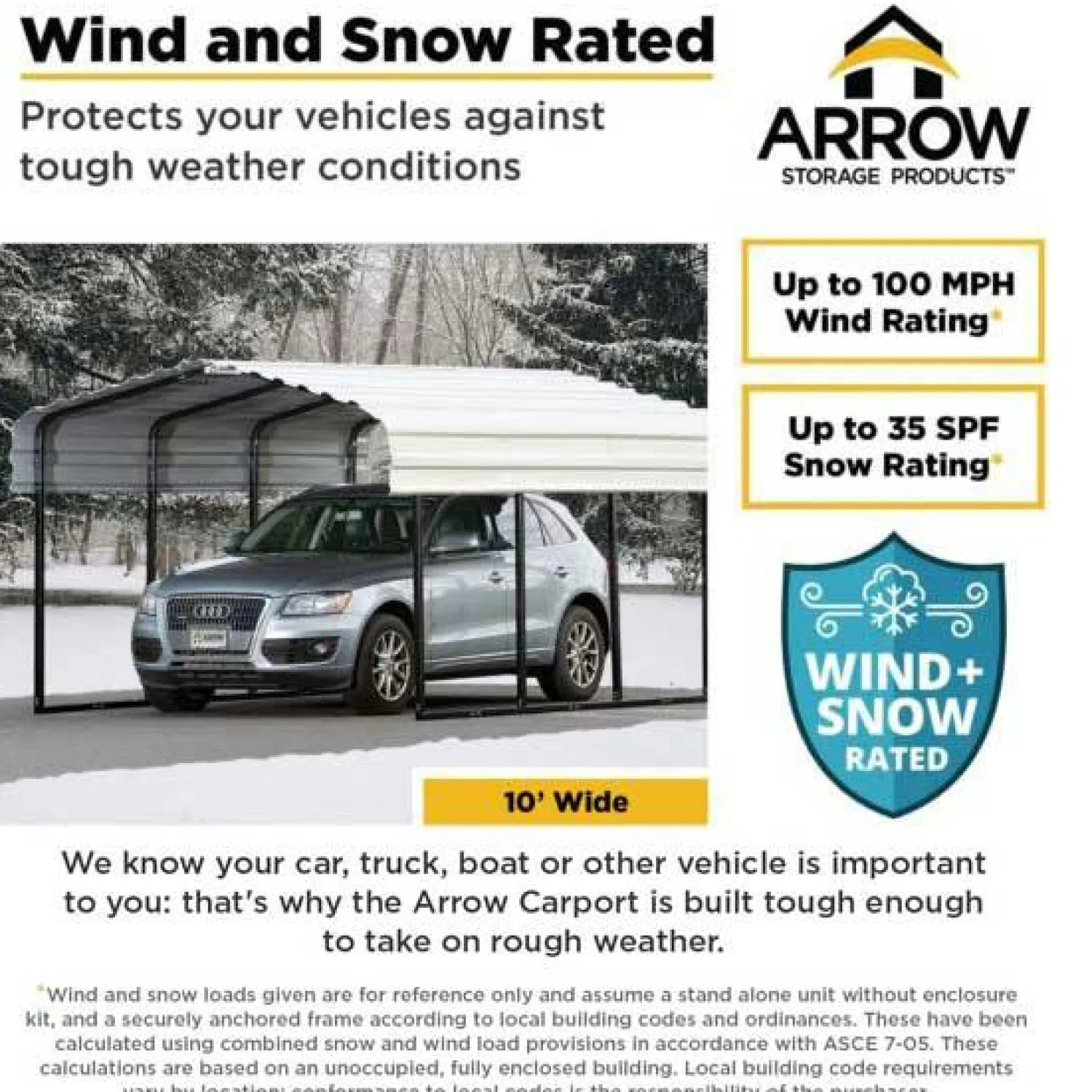 - An all-weather carport that will protect your vehicle or outdoor space all-year long: the Arrow Carport is built to take on even tough weather – winds up to 100 MPH, and a snow load of 35 PSF.