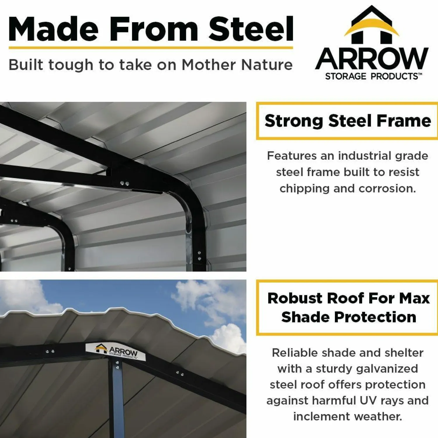- A heavy-duty, galvanized steel roof that’s built to last – the Arrow Carport features a 29-gauge painted galvanized steel for corrosion resistance