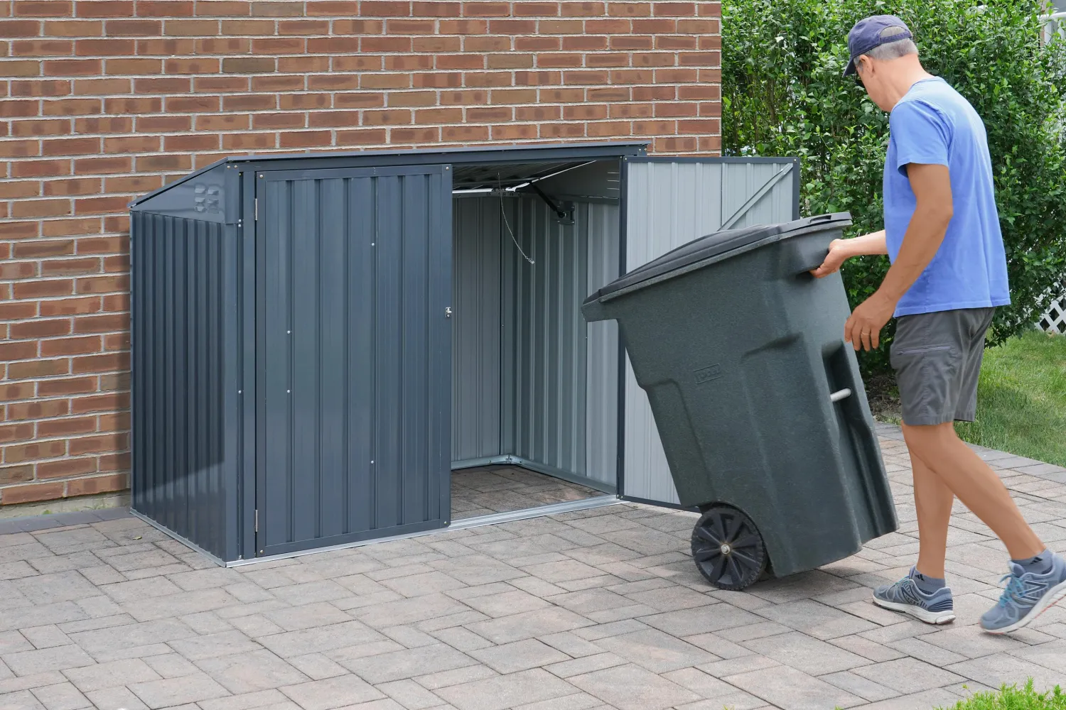 - GARBAGE CAN STORAGE – Easily fits most 96-gallon trash cans