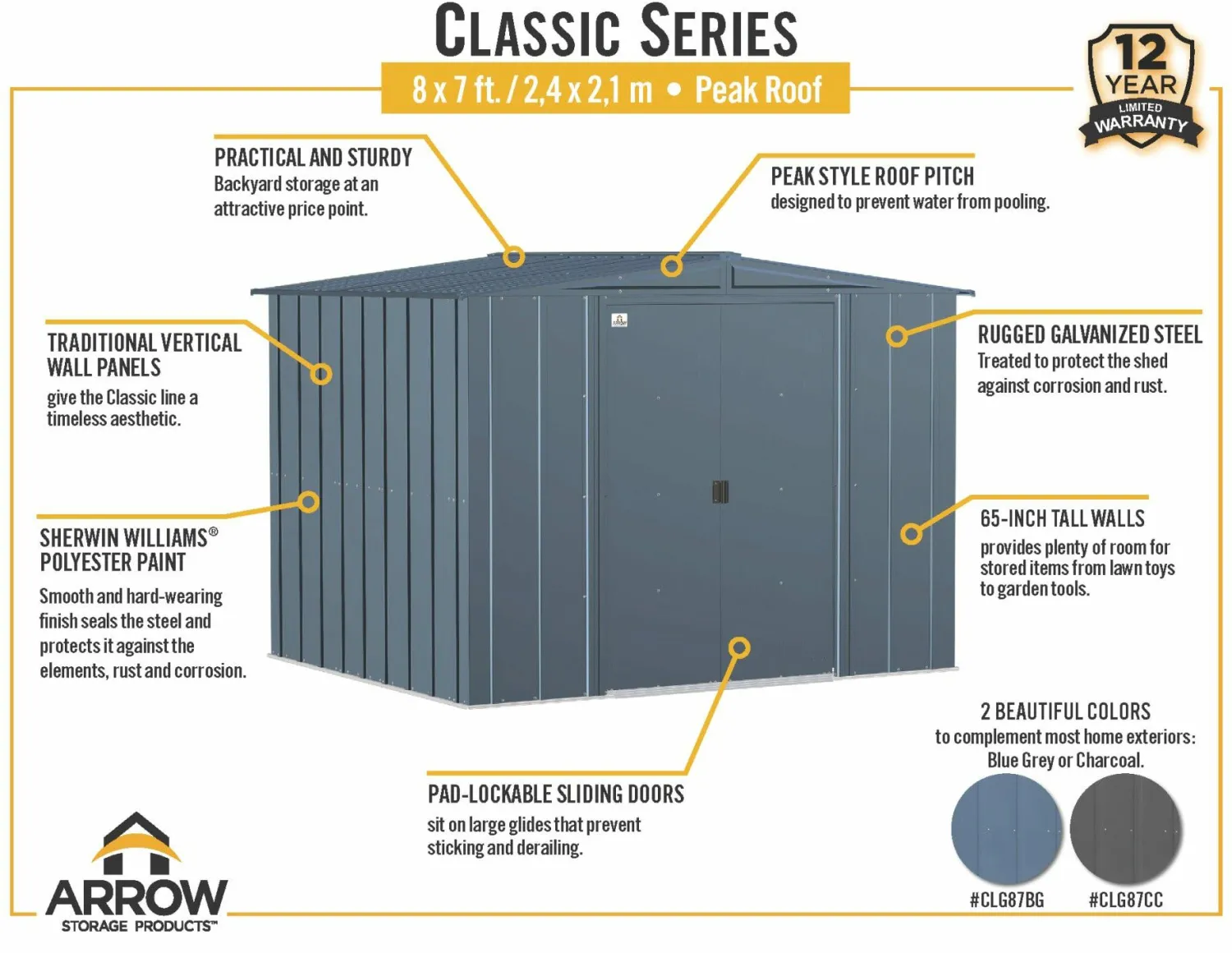 Are you looking for a practical, sturdy storage unit for your backyard? The Arrow steel storage shed is engineered to protect your landscaping equipment, tools, and gardening supplies, safe from the elements. The shed is made of galvanized steel that’s treated to prevent rust and corrosion. It has a low gable roof that’s designed to prevent water from pooling. It has sliding doors that can be secured with a padlock. The Arrow shed is a good-looking unit, too. The shed’s timeless vertical wall panels are finished with smooth, hard-wearing Sherwin-Williams Paint finish protects against the elements and seals the steel against rust and corrosion.