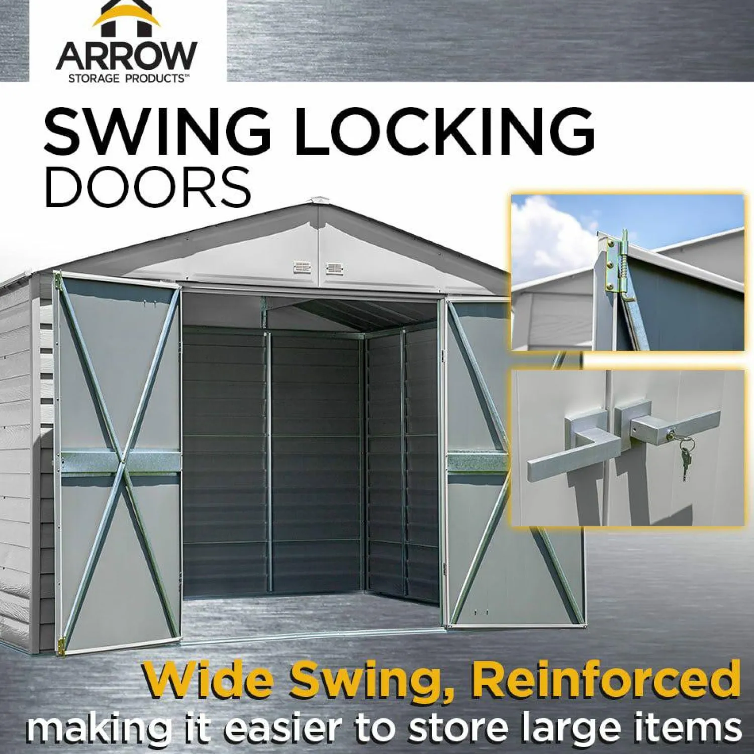The Arrow line of strong, sturdy steel storage sheds is a pleasant addition to your backyard. Made with galvanized steel that is treated to provide long-term protection against corrosion and rust, Arrow sheds are engineered to protect your stored items from the elements. Inside, the 71 in. walls provide extra headroom, vertical storage space, and added entryway clearance. That makes it great for storing ladders, rakes, pole saws, and anything you want to pile high. The Arrow line also has a high gable roof to prevent pooling of rainwater and debris, built-in air vents for better circulation, and locking door handles for security. It also has a smooth, strong Sherwin-Williams Paint Finish that protects it from the elements and gives the steel extra protection from rust and corrosion.