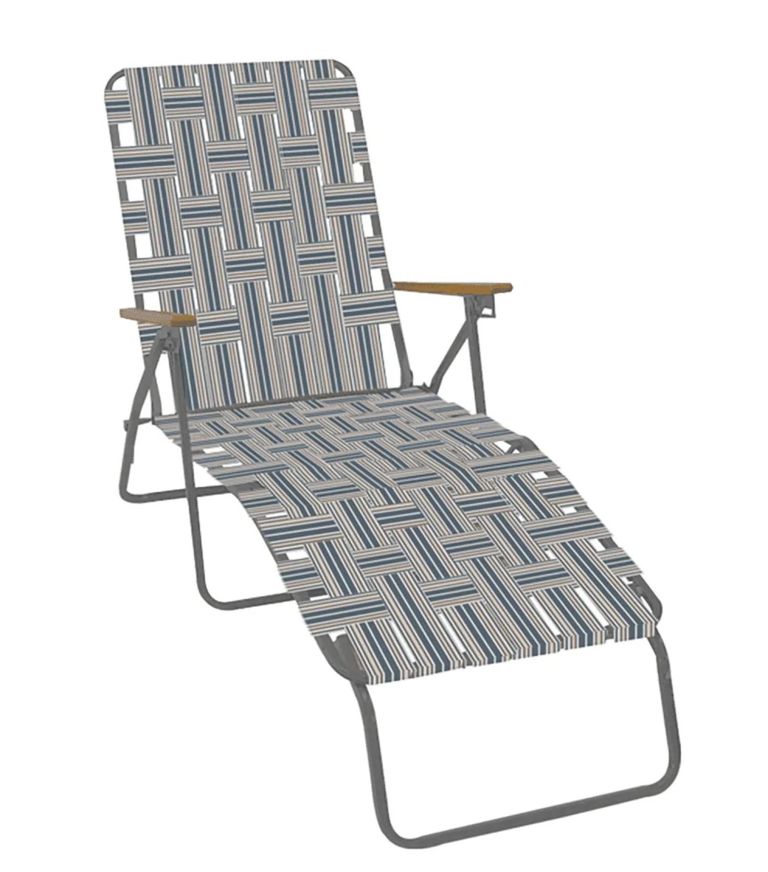 The Folding Web Chaise Lounge with hardwood arms is perfect for when you just need to lay back and relax. Tri-fold for comfort and easy storage. Has a rust-resistant powder coated steel frame.