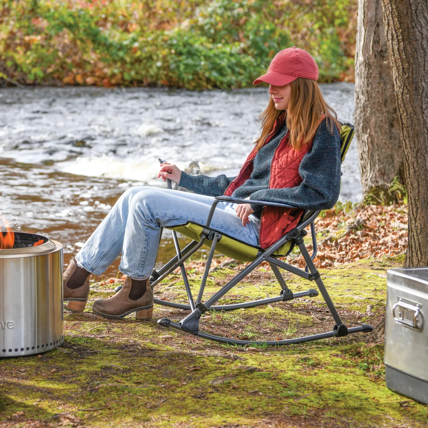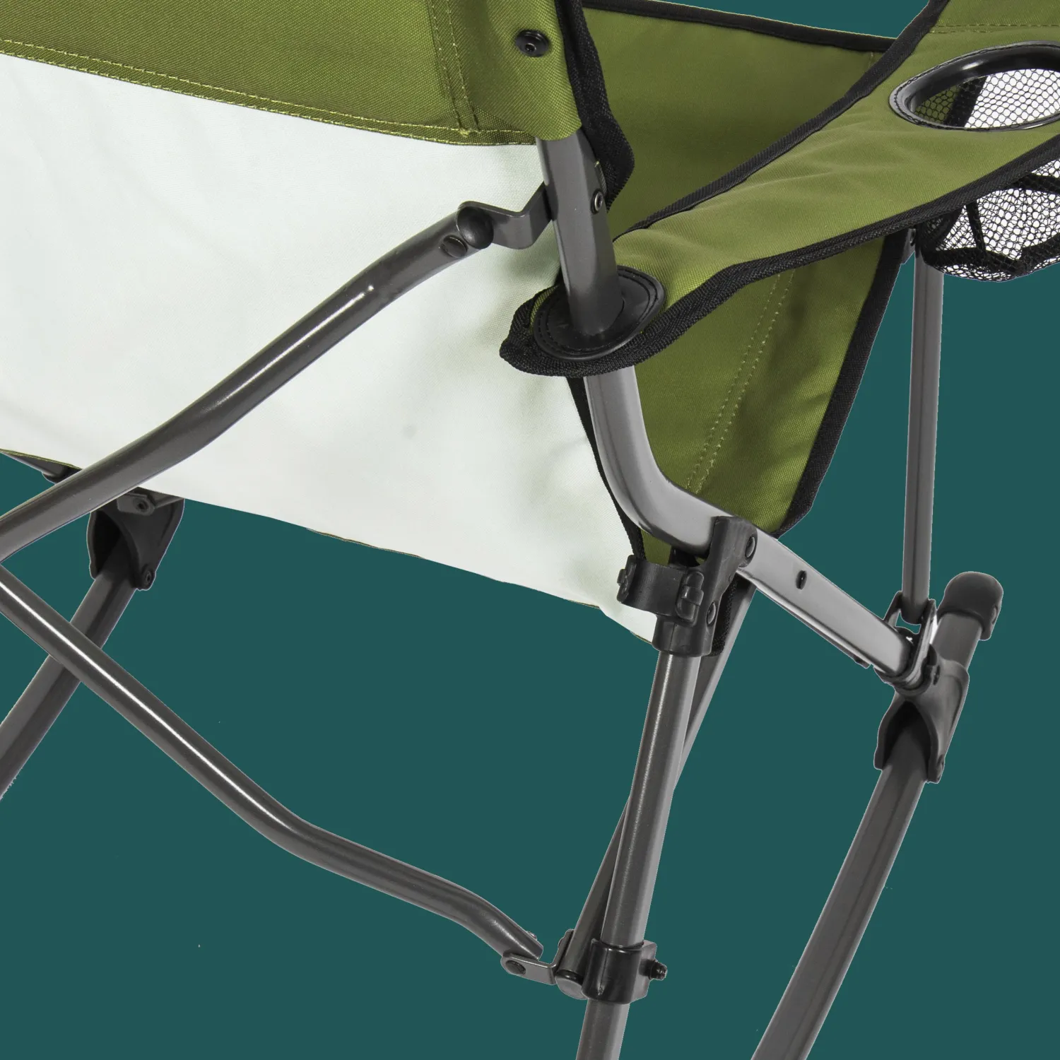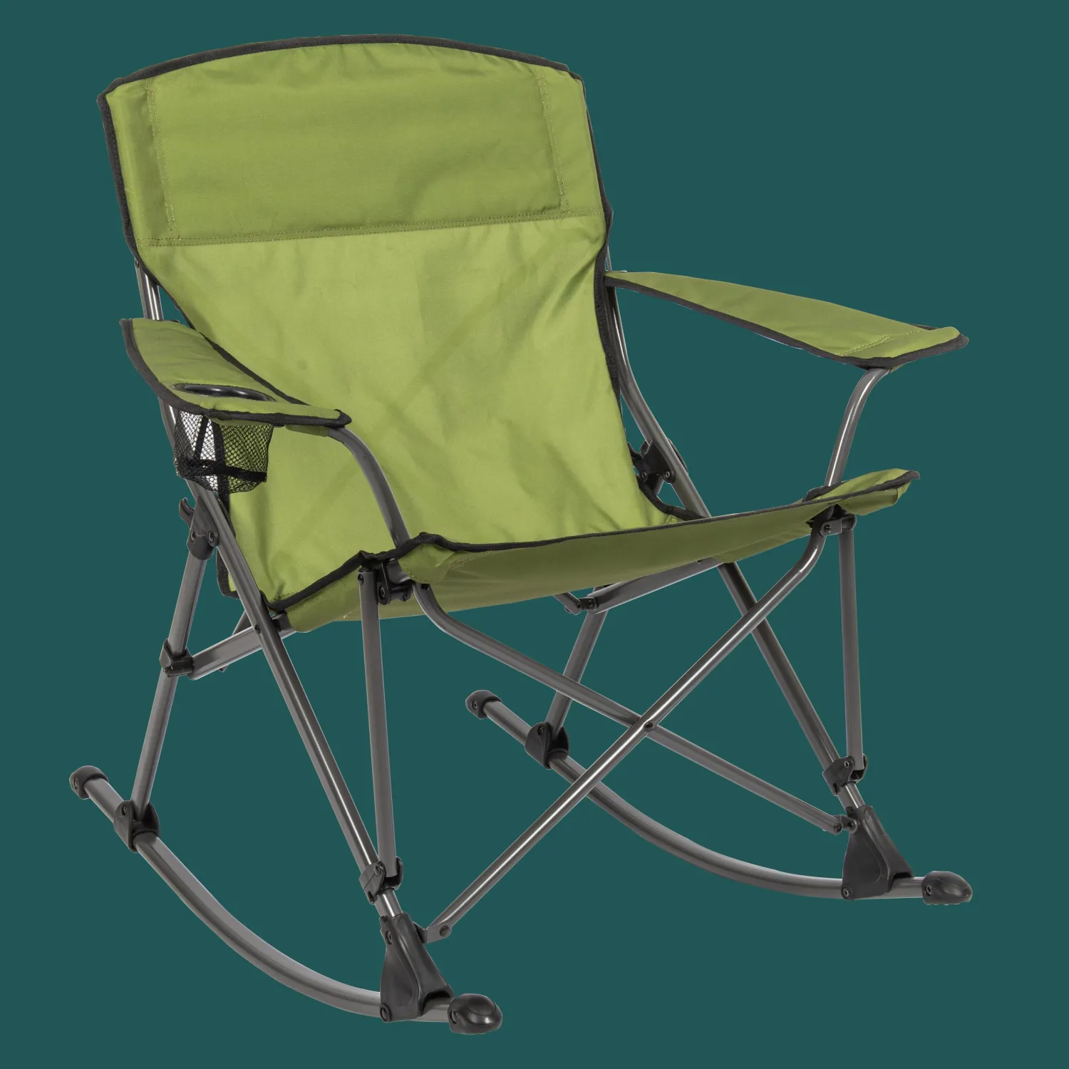 Rock the campground with the new Quad Rocker folding rocking chair. This rugged, portable rocker has a durable lightweight frame and a rugged, waterproof seat, back, and armrests. The soft arm quad rocker has compact design for easy, efficient transportation, and folds nicely for convenient storage in a carry bag. This stylish, tough rocker includes a cup holder that you can use for the beverage of your choice.