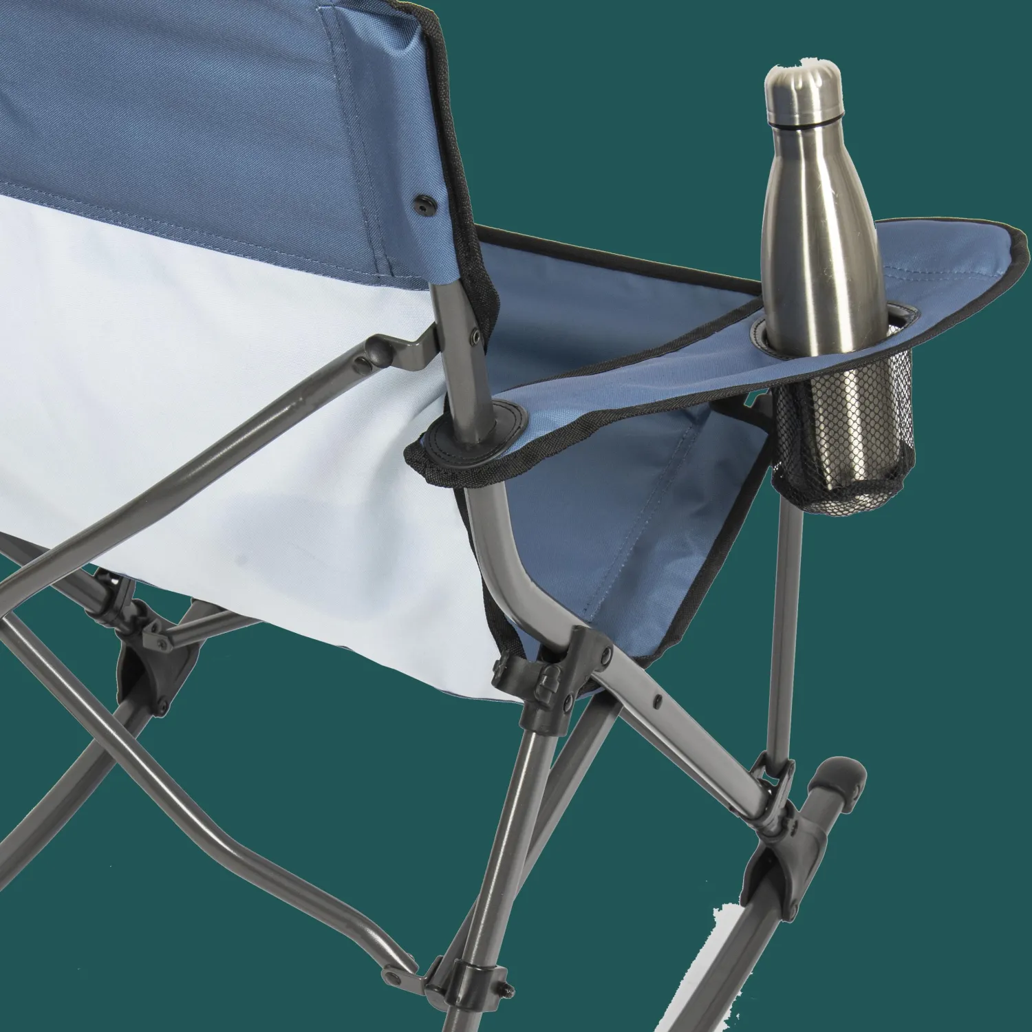 Rock the campground with the new Quad Rocker folding rocking chair. This rugged, portable rocker has a durable lightweight frame and a rugged, waterproof seat, back, and armrests. The soft arm quad rocker has compact design for easy, efficient transportation, and folds nicely for convenient storage in a carry bag. This stylish, tough rocker includes a cup holder that you can use for the beverage of your choice.