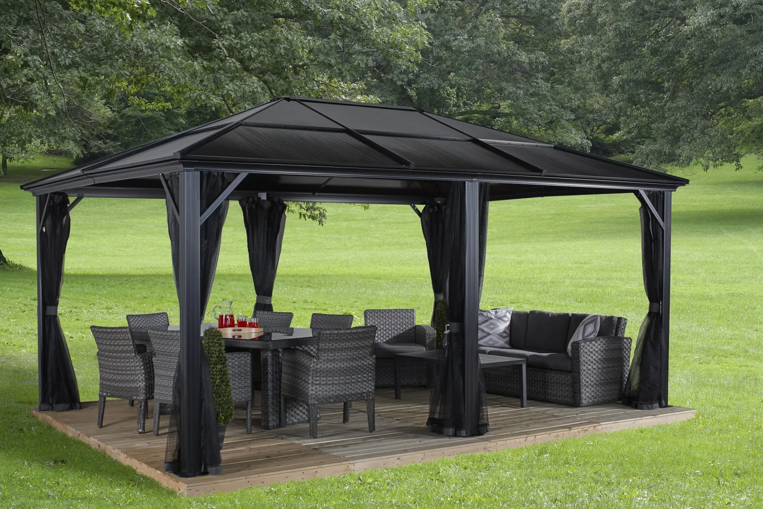 The Sojag Meridien Gazebo 12 x 16 ft. sun shelter is a nice mix of classic and modern design. It can match any home without any problem. It supports a poly-carbonate roof allowing sunlight to penetrate inside without letting ultraviolet rays to reach you. The Meridien gazebo will shelter your most beautiful evenings with friends. You can adapt it to the size of your table!
