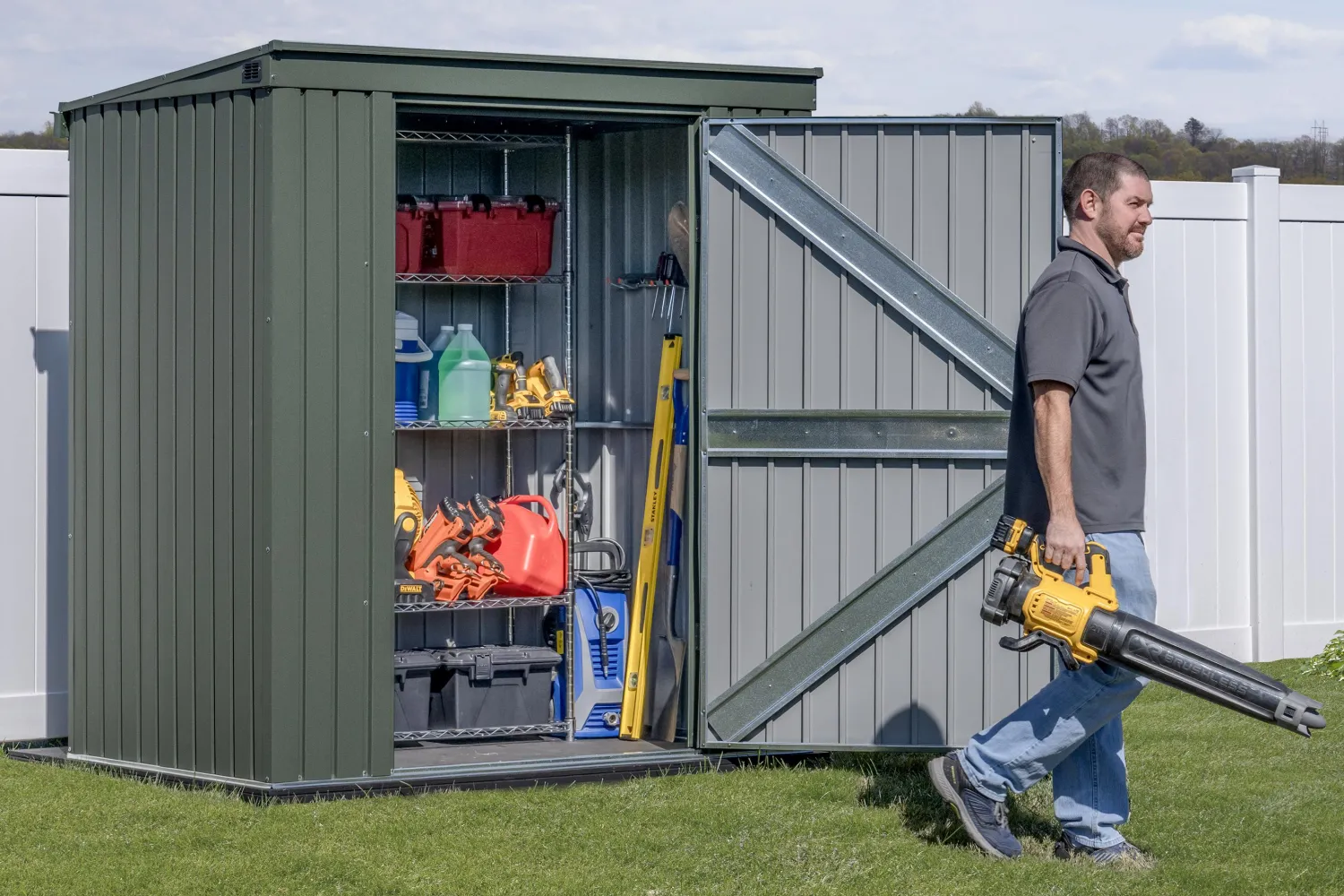 - The tall 72-inch wall height allows for easy storage of large items. Enough space for your push mower, spreader, rakes, shovels, and more