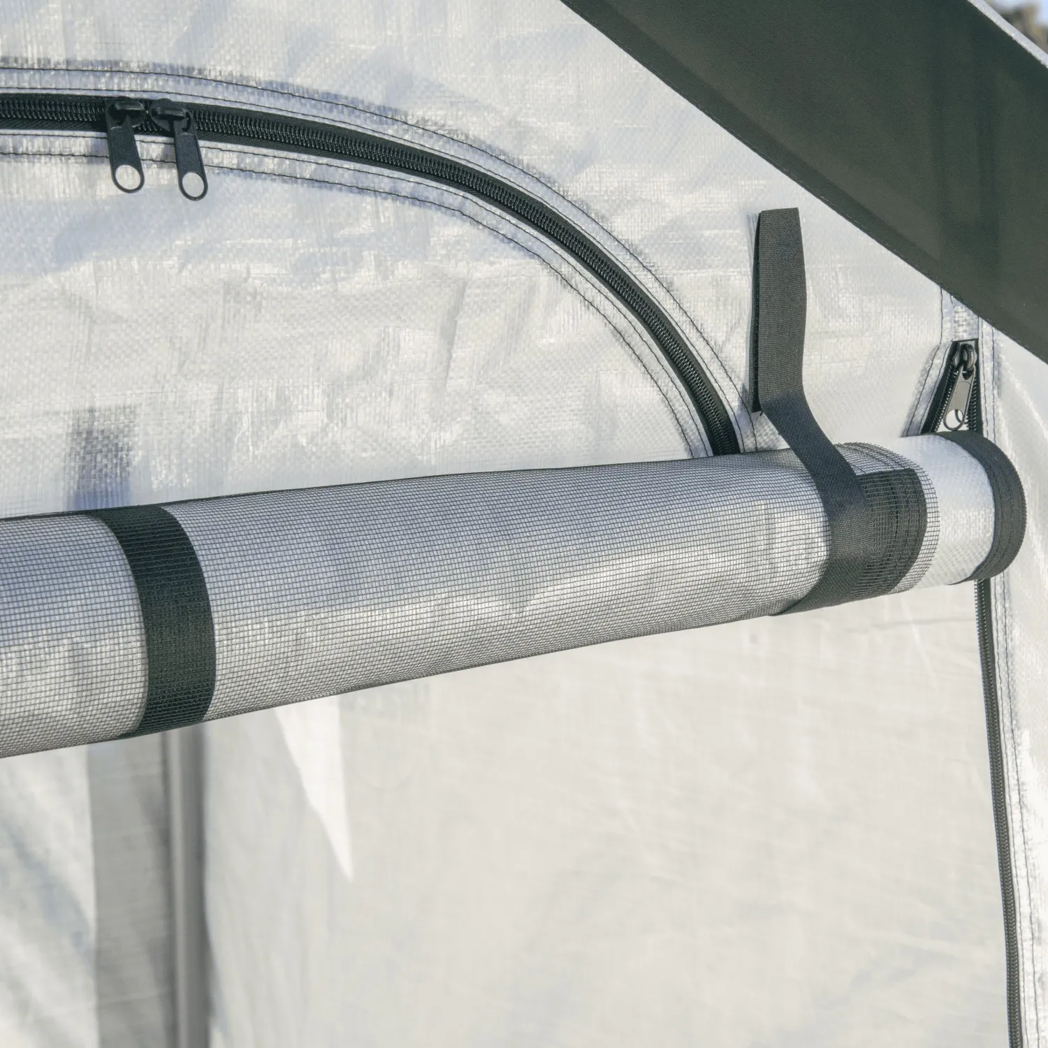 - Half-moon-shaped zippered screens on both end panels for adjustable air circulation