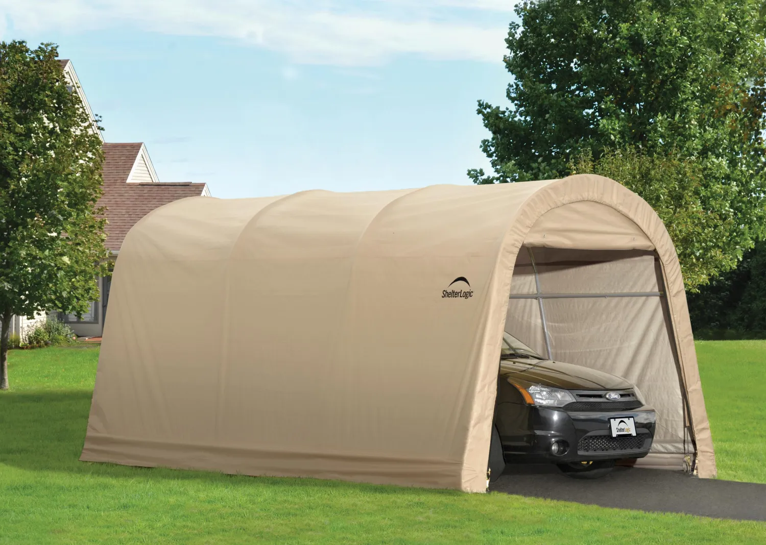 The ShelterLogic AutoShelter Instant Garage® shelter is an excellent storage solution for motorcycles, ATVs, jet skis, trailers, lawn and garden equipment, tractors, snow mobiles, wood or other bulk storage. The round roof shape is excellent at shedding the elements. A good quality fabric structure at a affordable price.