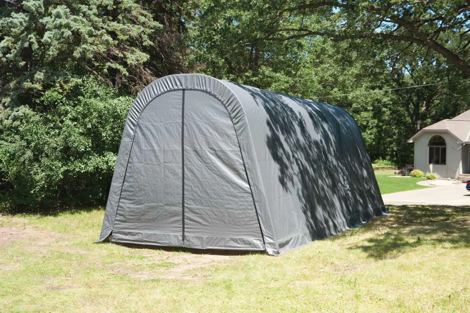 The ShelterLogic 14 ft. x 32 ft. x 12 ft. Instant Garage has quality features that come standard. The Instant Garage is our most popular selling fabric-covered shelter for all-season protection against the elements. This low-cost shelter solution is designed for cars, trucks, boats, outdoor equipment, snowmobiles, ATVs, personal watercraft, motorcycles, bulk storage, and more!