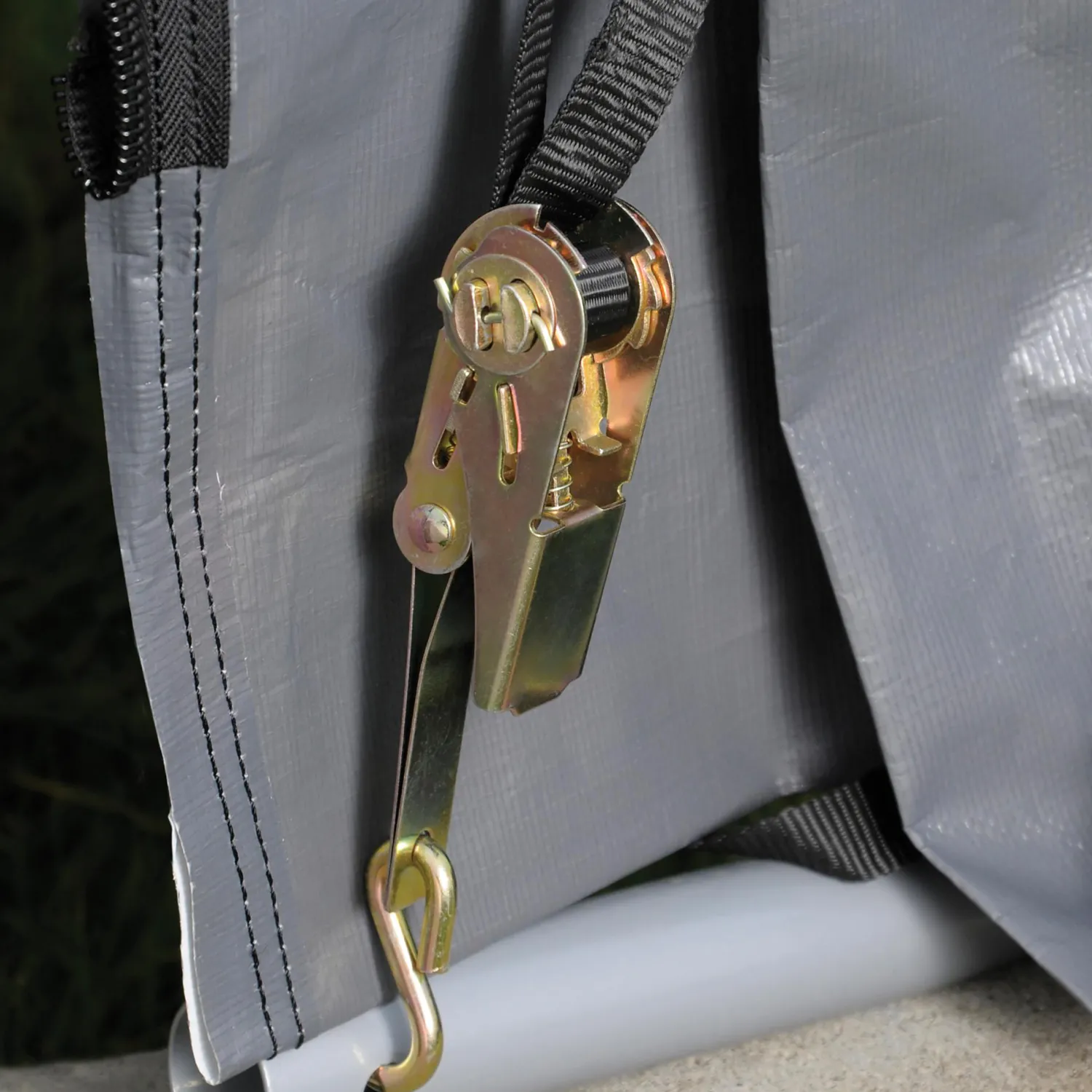 - Ratchet Tite cover tensioning system ensures a drum tight cover and door-panel connection to shelter frame. Quality ratchet and web strap components keep cover tight and neat looking.