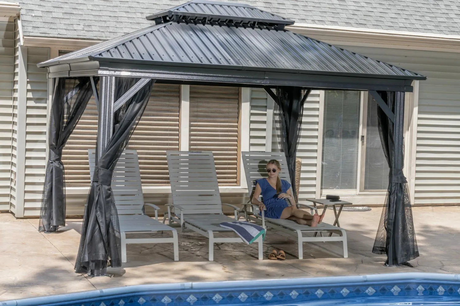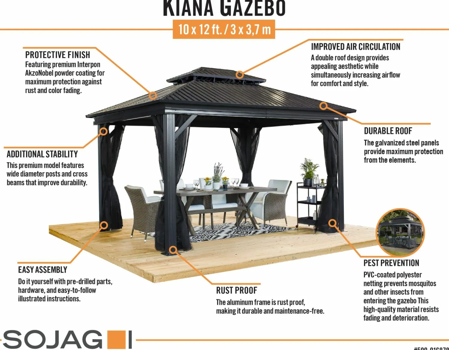 Sojag’s Kiana 10 x 12 ft. Rustproof Aluminum Frame Gazebo will transform your outdoor living space into a shaded oasis. Furthermore, its contemporary design will complement almost any backyard. A galvanized steel roof is powder coated making it scratch resistant and durable. The gazebo’s frame is made of aluminum, making it rustproof and highly corrosive resistant. Stainless steel screws are used to prevent rusting where parts are joined. High quality PVC-coated mesh mosquito netting is four times stronger than traditional nylon netting which means it will provide insect protection for years. Enhance your outdoor living situation today with Sojag’s Kiana 10 x 12 ft. Gazebo!