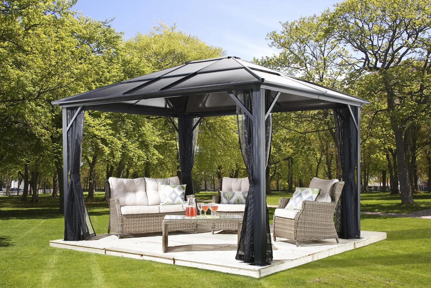 The Meridien Gazebo and sun shelter is an attractive mix of classic and modern design. This premium powder coated aluminum gazebo is perfect for year-round use and offers attractive protection from the elements in virtually any backyard space. Featuring a sturdy, polycarbonate roof, this gazebo protects against harmful UV rays whilst allowing for sunlight to penetrate inside the structure. Features a convenient detachable mosquito screen, the Meridien gazebo will shelter your most beautiful evenings with friends no matter what the weather may bring.