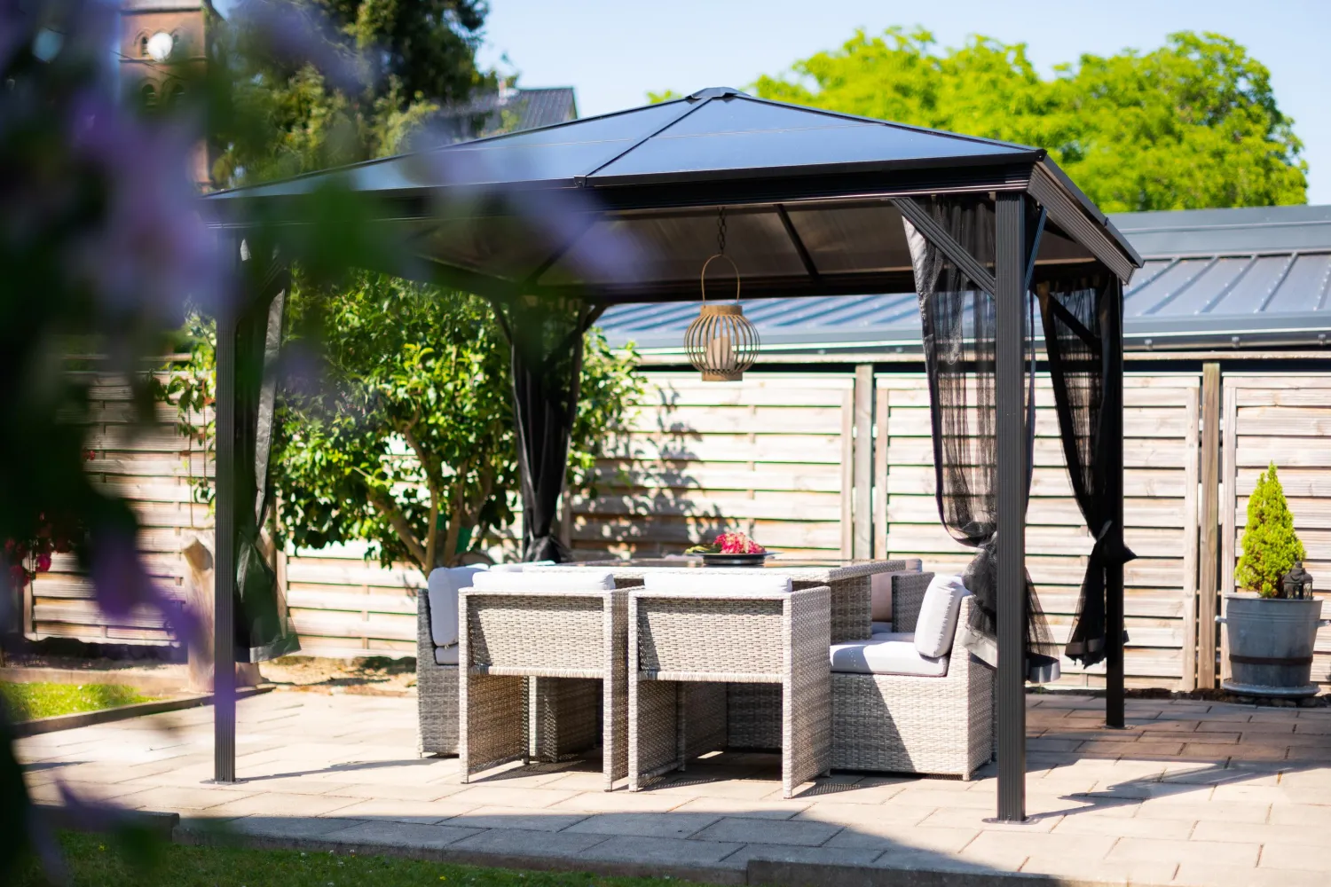 Improve your outdoor setting with a sun shelter that stays up all year long. The Sojag Verona Gazebo is perfect for those who enjoy a nicely shaded environment on a hot Summer day or the feeling of a warm breeze on a summer night. This sun shelter’s modern design features high quality aluminum and includes a nylon mosquito net to keep your space free from pesky bugs. The roof is made of weather-resistant corrugated polycarbonate sheets, making this sun shelter perfect for all seasons.