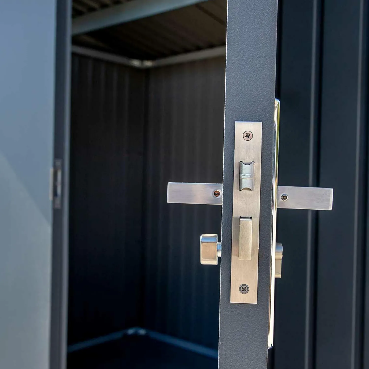- CONTEMPORARY DESIGN – The new squared wall panel design of this steel shed gives a modern clean appearance. The sturdy reinforced, wide swing doors included a squared off brush nickel handle with a key lock protecting your items when not needed