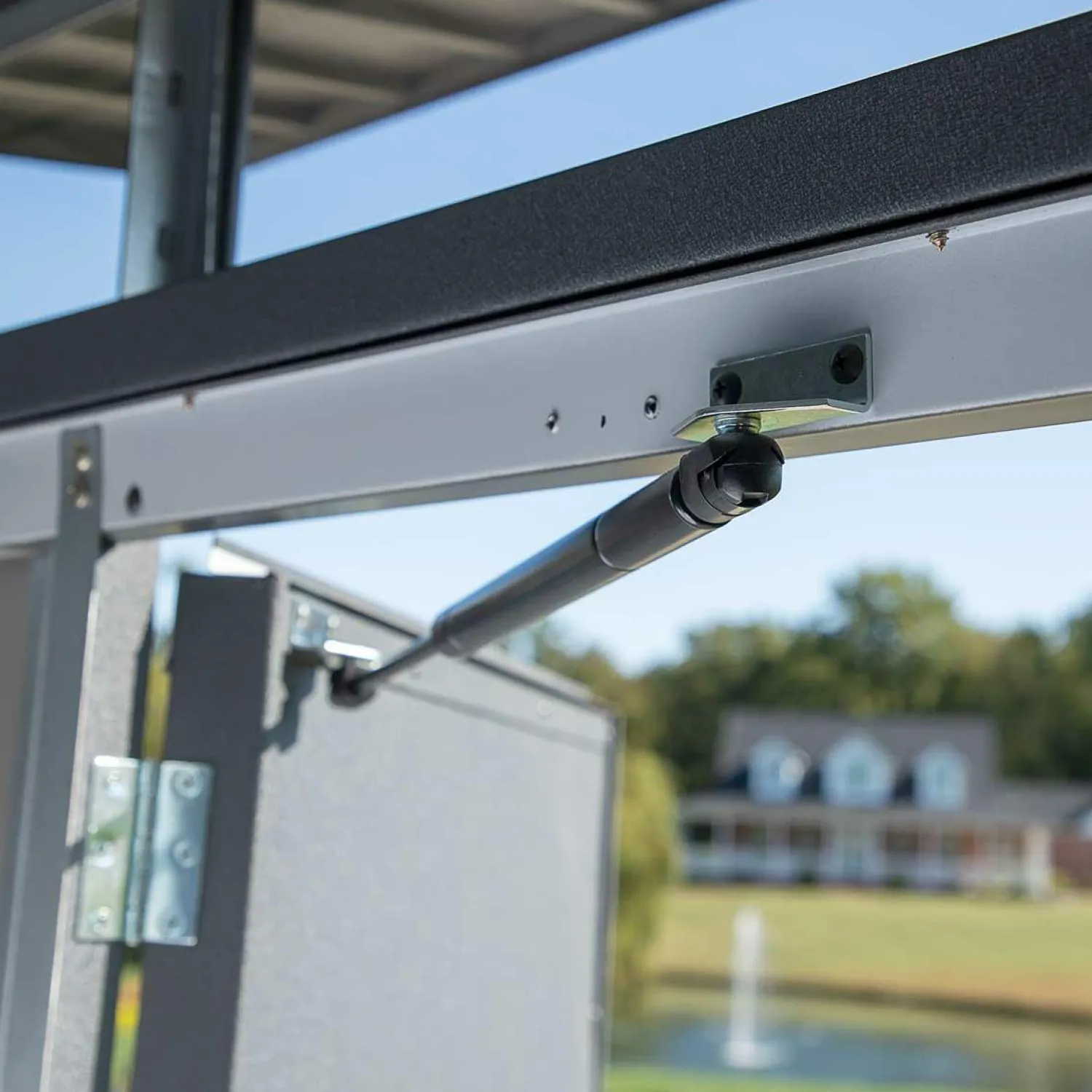 The Denali premium steel shed is a stylish, sturdy storage solution for your backyard. The Denali is made of Galvalume, an aluminum, zinc, and silicon-plated steel that offers superior rust protection. The steel is 70% thicker than standard sheds. The squared wall panel design gives it a modern, clean appearance, and the windows allow natural lighting. The shed has fully enclosed double swing doors with pneumatic assists, a brushed metal handle, and a key locking deadbolt.